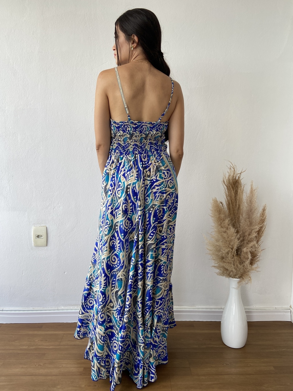 Apresentamos o VESTIDO INDIANO LONGO EM SEDA, uma peça de modelagem ampla que exala conforto e leveza.